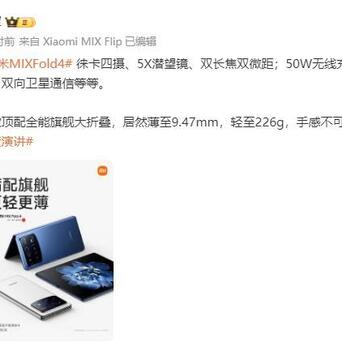 大家看看小米将要发布的MIX Fold4的配置信息,简直是让对手难以招架了。大家看看薄度,重量仅有226克,和市面上的iPhone15 Pro Max差不多,而且厚度也控制得非常好,几乎和SIM卡槽一样薄,夸张的是厚度会小于9.5mm,我看了一眼几乎超过了市面上在售的所有折叠屏手机。